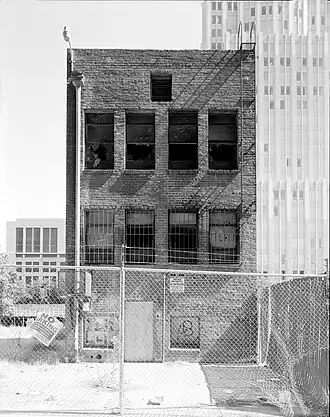 The building was originally built in 1861 by Leland Stanford and he used one of the rooms as his office.[2][3] It was also a part of the tunnel system as a part of the raised level of buildings in Sacramento. Replete with 25 office suites in the early 1990s, the edifice was still in use while neighboring buildings had all been demolished.[3] After this point, the building itself was the subject of many fires during its years of vacancy.[4] While plans were considered to incorporate the facade of the old building with new construction planned at its site, one last fire seriously damaged it in 2003 and it was subsequently demolished.[4][5]