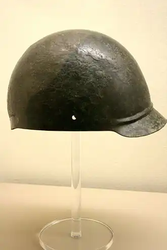 The Coolus helmet (named for Coolus, France) was a type of ancient Celtic and Roman helmet popular in the 1st century BCE.[1][2] It was typically made in bronze or brass and,[3] like the Montefortino type with which it co-existed, was a descendant of Celtic helmet types. The explanation of the choice to use bronze can be attributed to the type of warfare that the helmet was used for; also the cultural affinities have influence on why the helmet was made the way that it was.[4] Within a long process of evolution, Roman military armor for the head developed from early pre-Roman helmets. Rome itself had no proper tradition of such objects, as most of the soldiers of the Early Republic made use of helmets produced by the Etruscans, whose craftsmen were known for their ability to make vessels.[5]