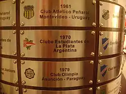 - ^ a b c d "Conocé en detalle el trofeo original de la Copa Libertadores y las chapitas de los campeones", Cancha Llena, 22 Sep 2015