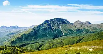 Cope Mountain is located nine miles (14 km) southwest of Kodiak on the northeast coast of Kodiak Island.[2] Precipitation runoff from the mountain drains into Sargent Creek thence Womens Bay. Topographic relief is significant as the summit rises 2,400 feet (732 meters) above Sargent Creek in approximately one mile (1.6 km) and the east face rises 1,700 feet (518 meters) in 0.4 miles (0.64 km). The mountain's name was applied in 1910 by the United States Coast and Geodetic Survey to honor Harry P. Cope, an Englishman who arrived in Kodiak from San Francisco in 1868.[4] He was the first postmaster at Kodiak and was known locally as "Uncle Harry."[2] The toponym was officially adopted in 1941 by the United States Board on Geographic Names.[2]