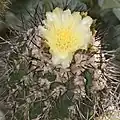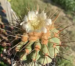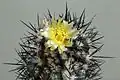 Copiapoa comprises 32 morphologically defined species and five heterotypic subspecies.[1] The species in this genus form dense cushions of hundreds of large, individual plants or produce only solitary plants. The shoots are spherical or elongated cylindrical. The spines, which are usually present, are variably shaped. On the apex, the species are usually densely woolly-haired. The ribs are clearly developed. These species vary in form from spherical to slightly columnar and in color from a brownish to blue-green bodies. They have warty ribs and spiny areoles, and they usually produce tubular yellow flowers, which grow from woolly crowns on the apex in summer. They are bell- to funnel-shaped and open during the day. The short, circular pericarp is glabrous. The flower tube is short and broad. The small, smooth fruits contain large, shiny, black seeds.[2]