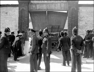 Around noon, three thousand protestors assembled. Within twenty-five minutes, an attempt was made to breach the yard gate by ramming it with a truck. According to Oireachtas records, there were approximately 20 men in the truck which they ran against the gate.[7][8] The Minister for Justice P. J. Ruttledge, said that the truck "with those people in it charged through those cordons of Guards; that several Guards jumped on to the lorry and tried to divert the driver by catching hold of the steering wheel and trying to twist it".[9] Some contemporary news sources suggest that the ramming truck knocked down the surrounding police cordon "like ninepins and crush[ed] a police inspector against a gate".[2] Later sources suggest that the senior officer (a superintendent) was injured in a fall, while attempting to avoid being struck, rather than being hit directly by the truck.[9]