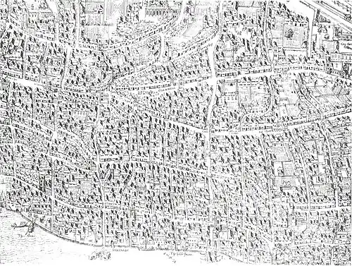 The "Copperplate" map of London is an early large-scale printed map of the City of London and its immediate environs, surveyed between 1553 and 1559, which survives only in part. It is the earliest true map of London (as opposed to panoramic views, such as those of Anton van den Wyngaerde). The original map was probably designed for hanging on a wall, and is believed to have measured approximately 3 feet 8 inches (112 cm) high by 7 feet 5 inches (226 cm) wide.[1] No copies of the printed map itself are known to have survived; but between 1962 and 1997 three of the original engraved copper printing-plates – from a probable total of 15 – were identified. Although only a fragmentary portion of the map is known, the three plates cover the greater part of the built-up heart of the City of London.