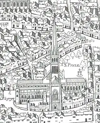 - St Paul's Cathedral (western City plate) is shown with its spire. The spire was lost in a fire in 1561.