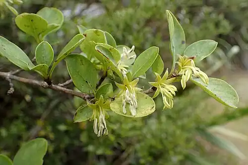 C. foetidissima is dioecious, meaning that male and female flowers are borne on separate plants.[14] Flowering occurs between October and November.[12] The flowers are solitary and occur on the ends of branchlets.[11] Male flowers; calyx cup-like, 4 or 5-toothed; corolla bell-shaped, 4 or 8 lobed to the middle; anthers are large, elongated oblong in form, and as long as the corolla. Female flowers; the calyx-tube is short and narrowly ovoid, tubular, and toothed; corolla is a curved tube with 4 or 5 splits extending one third to half way down, styles are substantial and long.[15] Fruiting occurs between March and July. The drupes are 7–10 mm (0.28–0.39 in) in length with an oblong shape.[12] They are yellow to orange-red in colour,[4] and are dispersed by frugivory.[12]