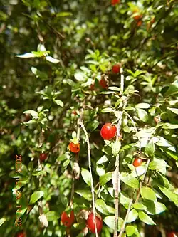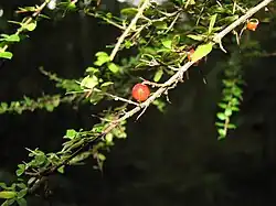 Fruiting occurs in late summer or early autumn, typically January to March, and results in a drupe style fruit. The fruit is small and globular or egg shaped. It is glossy and ranges in colouration from orange to dark red. The fruit is crowned by the remanent calyx of the flower.[5] The fruit is edible and can be used in cooking, typically in salads or puddings.
