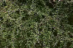 Coprosma virescens is an endemic New Zealand plant in the genus Coprosma of the family Rubiaceae.[1] Its Māori name (in common New Zealand usage) is mikimiki,[2] a name which is also applied to closely related species such as C. dumosa, C. rhamnoides, C. propinqua and C. crassifolia.[3] It is a small-leaved evergreen shrub or tree which grows 2–3 metres (6 ft 7 in – 9 ft 10 in) high. It has very slender, more or less glabrous divaricating branches. The small leaves are petiolate with petioles from 2–5 millimetres (0.079–0.197 in) long. The leaves narrow suddenly at the petiole and may be up to 9 millimetres (0.35 in) long and 6 millimetres (0.24 in) wide with wavy margins or a few blunt teeth throughout South Island in lower montane forest and scrubland. The apetalous male flowers occur in axillary clusters of one to two on very short branches. Female flowers are found on their own at the ends of short branchlets.[1]