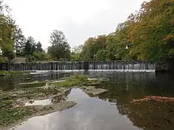 Near Brainshaugh, the river passes over a horseshoe dam, built in 1775 by John Smeaton for John Archbold of Acton and Edward Cook of Brainshaugh. It is built of squared stone, and was repaired and modified in 1926. The downstream face is vertical, and the water falls 8 feet (2.4 m). The curved dam has a radius of 170 feet (51.8 m) and supplied a mill race to the south of the river.[31] This originally powered an iron and tin foundry, subsequently converted to a woollen mill in 1791, and becoming derelict in 1884. From 1915, it was used to manufacture a white pigment called Hydrate of Alumina, and became one of the first factories in the country to be powered by hydroelectric power when a Gilkes water turbine was fitted into the millrace. The factory closed in 1930 when its lease was not renewed following pollution of the river. The mill building was converted into flats in 1968.[32] At the eastern end of the site is Factory Bridge, consisting of three segmental arches, which was built of rock-faced stone in 1865. Some railings were added in the 20th century.[33]