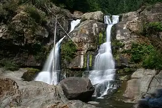 Coquiller River Falls, is a two-tier waterfall located in the far north tip of the Rogue River – Siskiyou National Forest, just east of Port Orford, on the Oregon Coast in Coos County,[1] in the U.S. state of Oregon. It totals 115 feet fall in two drops: the upper falls is 50 feet high and the lower tier, the tallest drop, is 65 feet. There are approximately 180 feet from the upper tier to the bottom drop of the waterfall.