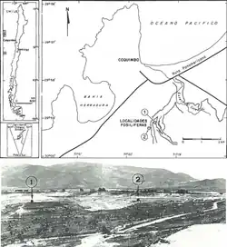 The Coquimbo Formation is largely deposited along the coasts and creeks of the Coquimbo Region. It can be found outcropping from Tongoy city to Caleta Chañaral (and Chañaral de Aceituno). The latter does not form part of the Coquimbo Region and is instead located at the southernmost extension of the Atacama Region, making this area the northernmost extension of the Coquimbo Formation.[15][16][17] In Tongoy, the formation runs across creeks that feature large marine terraces.[17] In Coquimbo, the formation can be traced as far as the Culebrón Park, with a more consistent extent at Quebrada Las Rosas.[24]