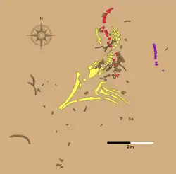 Diagram featuring the cetaceans skeletons found at Lomas del Sauce (yellow, red, and purple)
