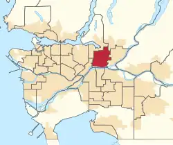 The Coquitlam–Maillardville district encompasses most of land of the city of Coquitlam except for the city centre, Westwood Plateau, and a small corner in the northwest that belongs to the Port Moody-Coquitlam electoral district. Coquitlam–Mallardville is bounded by North Road, the Brunette River, and Braid Street to the west; the Fraser River to the south; and the Coquitlam River, and Westwood Street and its extension south from Kingsway Avenue to the river, to the east. The north and northwest boundary follows the CPR tracks from Westwood Street to just north of Viewmount Drive. It then goes south along Viewmont and continues straight, to the end of Brookmount Road. From here it goes west along Brookmount Road and Brookmount Avenue, north of Fresno Place, Harbour Drive, and Bent Court to Gatensbury Avenue, then south to Foster Avenue, west to Blue Mountain Street, south to Austin, and west to North Road.[1]