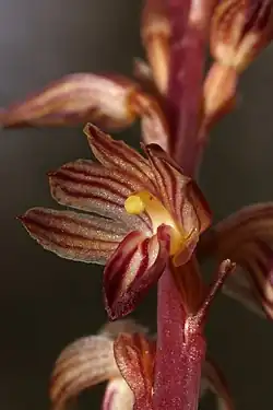 Like other coralroot orchids, the plant takes its name from its coral-shaped rhizomes.[4] It has an erect stem about 15 to 50 cm (6 to 20 in) tall that may be red, pink, purple, or yellow-green to almost white. The leaves lack chlorophyll and are reduced to colourless scales that sheath the stem. The plant also lacks roots, and relies upon parasitism of fungi for sustenance.