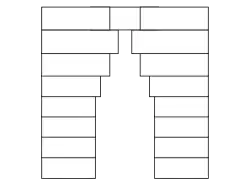 Although an improvement in load-bearing efficiency over the post and lintel design, corbeled arches are not entirely self-supporting structures, and the corbeled arch is sometimes termed a false arch for this reason. Different from "true" arches, "false" or corbelled arches are built of horizontally laid stones or bricks, not of wedge-shaped voussoirs converging towards, and being held together by a central keystone. Unlike "true" arches, not all of the structure's tensile stresses caused by the weight of the superstructure are transformed into compressive stresses.