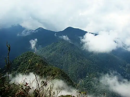 The Cordillera Occidental (English: Western Ranges) is the lowest in elevation of the three branches of the Colombian Andes. The average altitude is 2,000 m (6,600 ft) and the highest peak is Cerro Tatamá at 4,100 m (13,500 ft). The range extends from south to north dividing from the Colombian Massif in Nariño Department, passes north through Cauca, Valle del Cauca, Risaralda, Chocó, and Caldas Departments to the Paramillo Massif in Antioquia and Córdoba Departments. The cordillera is paralleled on the east by the Cauca river.[2] From this massif the range divides further to form the Serranías de Ayapel, San Jerónimo and Abibe. Only to recede into the Caribbean plain and the Sinú River valley.