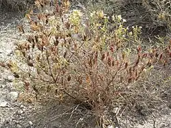 Cordylanthus ramosus is a species of flowering plant in the family Orobanchaceae known by the common name bushy bird's beak. It is native to the western United States where it grows in mountains and plateau, including the sagebrush of the Great Basin. It is an annual herb producing an erect, branching gray-green form, often tinted with red, becoming bushy at its most robust and appearing not unlike a sagebrush. The small leaves are narrow and linear or divided into several narrow, thready lobes. The inflorescence is a small spike of a few flowers surrounded by bracts which are linear or divided into narrow, thready lobes like the leaves. The bracts are faintly woolly and occasionally bristly in texture. The flower is one to two centimeters long with a hairy yellow pouch enclosed in darker, tougher reddish sepals. This plant had a number of historical medicinal uses for the Navajo people, who used it as an emetic.[1]