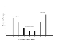 The core-satellite hypothesis is a theory in ecology that attempts to explain the pattern of species distributions seen in nature. According to the theory, first proposed by Ilkka Hanski in 1982 and developed further subsequently, suggests that species within a particular ecosystem can be classed as "core" species which are locally abundant and widely distributed; and "satellite" species which are sparsely distributed. Hanski noted that regional species distributions are bimodal, an observation made earlier by Christen C. Raunkiær (occupancy frequency distribution) - with most species being uncommon (occurring only in some patches) and some species being ubiquitous. Hanski proposed a null metapopulation model that produces such a bimodal distribution. It assumes that all species are capable of utilizing all sites and makes use of local colonization and extinction dynamics. He also proposed a connection between the core-satellite hypothesis and the r/K selection theory.[1][2] An examination of host-parasite data was interpreted by some researchers including Robert May as suggesting that bimodality could be produced by certain distributional features and result without the need for the metapopulation dynamics described by Hanski.[3]