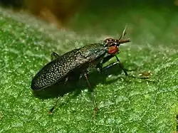 The adults of Coremacera marginata grow up to 7–10 millimetres (0.28–0.39 in) long. These flies have a slender, dark greyish body. The prominent eyes are reddish. The brown-yellowish antennae are forward-pointing, with a hairy 3rd segment and a whitish arista. The dark grey wings are mottled with greyish spots.[3][4]