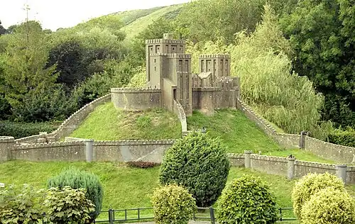 Corfe Castle was built on a steep hill in a gap in a long line of chalk hills, created by two streams eroding the rock on either side. The name Corfe derives from the Old English ceorfan, meaning 'a cutting', referring to the gap.[5] The construction of the medieval castle means that little is known about previous activity on the hill. We know from contemporary writing that Anglo-Saxon nobility treated it as a residence, such as Queen Ælfthryth, wife of Edgar, and there are postholes belonging to a Saxon hall on the site.[6] This hall may be where the boy-king Edward the Martyr was assassinated in 978; contemporaries tell us that he went to the castle at Corfe to visit Ælfthryth and his brother.[7]