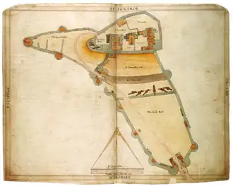 The castle remained a royal fortress until sold by Elizabeth I in 1572 to her Lord Chancellor, Sir Christopher Hatton. Ralph Treswell, Hatton's steward, drafted a series of plans of the castle; the documents are the oldest surviving survey of the castle.[30]