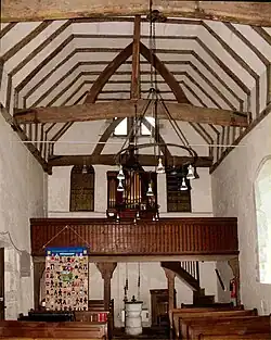 In the south-east of the chancel is a stone seat, thought to date from the 13th century. The vestry and south porch are later constructions. The altar rail is 18th-century, and there is a 19th-century gallery at the west end. The east end of the chancel was rebuilt in brick in 1855.[3][4]