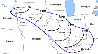 Along the front in South Dakota, an unorganized area of thunderstorms formed by 9:00 a.m. CDT. They rapidly organized and spread along the front, moving east-southeast into northeast Nebraska.[3] By midday, the storms reached northwestern and north central Iowa, supercells among them, while forming a west–east band and assuming a bow echo shape.[1][3]