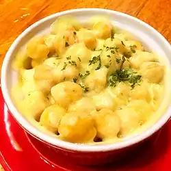 Some chefs have also experimented with adding alternative ingredients, such as Chinese mustard and doenjang.[4] In 2015, it was reported that a Korean American restaurant in California served a corn cheese dish that featured bone marrow and bonito flakes.[5]