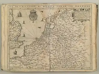 On 4 May 1567, a few days after Margaretha settled herself and her court in Antwerp for a few months in order to restore calm in this town, De Hooghe sold his "Hollandia-map" to the famous Antwerp printer Plantin. In 1567 his "Belgica-map appeared in the first edition of Ludovico Guicciardini's "Descrittione di tutti i Paesi Bassi". It is often assumed that this map was especially made for this book, but the differences in size show that De Hooghe just sold a slightly modified and signed reprint of these maps to the author. It is safer to assume that only the second version of this map was made for Guicciardini. The first unsigned version of this map must be dated prior to 1567, most probably rather close to the year 1559 of the peace of Cateau-Cambrésis and was made solely for use at the court. None of the existing first version maps that survived bears any sign of book binding, nor were they cut off in order to fit in Guicciardini's book.