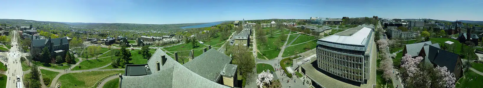 The central campus is flanked by two gorges: Fall Creek to the north and Cascadilla Creek to the south.