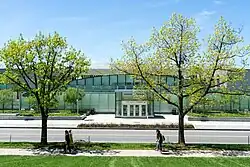 Just outside the Schoellkopf Crescent is the Fischell Band Center (dedicated 2013), a custom-built structure which is home to the Big Red Marching Band.[54] The building is a three-story glass structure designed by University Architect Gilbert Delgado, with slanted walls and ceilings for superior acoustics.[55] It also includes display cases for memorabilia, photos, and uniforms.[55]