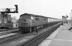 In 1958 diesel traction took over on The Limited in the shape of the pilot D600 Warships.[17] These however were not sufficiently reliable and D800 Warships began working the train by 1960, although the D600s, latterly shedded at Plymouth Laira and restricted in their range, could still be seen taking the service in Cornwall as late as 1961.[18] D1000 Western Class locomotives took over in 1964 but the D800s returned in 1968 - 1970, now working in pairs. Westerns were not fitted for electric train heating and so were replaced by Class 50 locomotives when air-conditioned Mark 2 carriages were introduced in 1975 and although these were initially unnamed, they were soon given names of warships, some of which were once carried by the earlier Warship classes. Class 47 diesel-electrics also appeared from time to time throughout the 1970s.