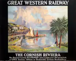 A series of books entitled The Cornish Riviera were published. The first was a 152-page book in 1904 – the first ever published by the railway company – written by A.M. Broadley, and revised several times, a total of five editions being published up until 1926. An abridged 36 page booklet was also produced for free overseas distribution. In 1928 a new version of the book, written by SPB Mais made its first appearance, with revised editions published in 1929 and 1934. In 1928 a poster featuring a painting by Louis Burleigh Bruhl was issued to advertise both the book and the railway service.
