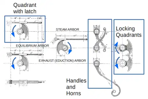 Even when operating the engine manually there are limits on how the engine can be configured. It is never appropriate to have both the exhaust and equilibrium valves open at the same time. To avoid this an additional pair of quadrants are used as “locking quadrants”. These are oriented so that in the closed position they lie almost touching, allowing either of them to move to the open position.[3]: 165 However once one is open it blocks the other from opening. Note that Pole[5]: 129 describes a more complex system of tappets and levers to achieve the same mutual locking effect between the exhaust and equilibrium valves.