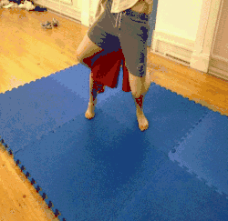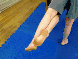 - With both hips now facing the same direction, the thrower steps with their inside leg between the throwee's legs pushing back and hooking their foot around the throwee's ankle lifting their leg to the rear.