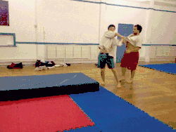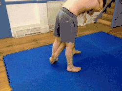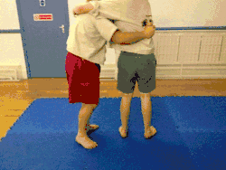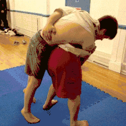 - The thrower moves their dominant foot in front of the throwee's dominant foot while pulling up the throwee's arm and tucking their dominant elbow into the throwee's armpit (keeping hold of the grips on the jacket).
