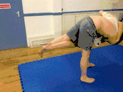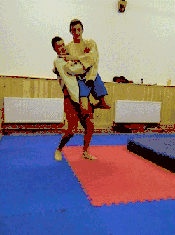 - With both hips now facing the same direction, the thrower lifts the throwee with their legs and flips the throwee head over heels over their shoulder.