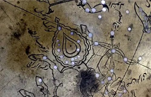 In Chinese astronomy, the stars of Corona Australis are located within the Black Tortoise of the North (北方玄武, Běi Fāng Xuán Wǔ).[74] The constellation itself was known as ti'en pieh ("Heavenly Turtle") and during the Western Zhou period, marked the beginning of winter. However, precession over time has meant that the "Heavenly River" (Milky Way) became the more accurate marker to the ancient Chinese and hence supplanted the turtle in this role.[75] Arabic names for Corona Australis include Al Ķubbah "the Tortoise", Al Ĥibā "the Tent" or Al Udḥā al Na'ām "the Ostrich Nest".[70][72] It was later given the name Al Iklīl al Janūbiyyah, which the European authors Chilmead, Riccioli and Caesius transliterated as Alachil Elgenubi, Elkleil Elgenubi and Aladil Algenubi respectively.[70]