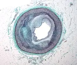 Micrograph of a coronary artery with the most common form of coronary artery disease (atherosclerosis) and marked luminal narrowing. Masson's trichrome.