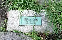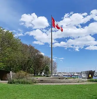A permanent memorial was designed by John McEwan[16] and erected by the Second World War 50th Anniversary Memorial Tribute Committee in 1995, the 50th anniversary of the end of the Second World War. Named the Victory-Peace Monument, it stands at the water's edge, in a small clearing south of the grove of trees. The monument is formed like an amphitheatre, with a ring of concrete steps around a brick-paved circle, at the centre of which is a black-tinted concrete pad. At its middle is a brass disk, 5.6 metres (18 ft) in diameter, inscribed with the words 1939 1945 PEACE and the word peace in other languages. Six of the surrounding steps have black granite blocks approximately 60 centimetres (24 in) by 67 centimetres (26 in), each being etched with words or artwork relevant to the war. On a platform at the south are also a set of bronze walls, formed like a ship's prow and bearing artwork depicting Canada's involvement in the Second World War. Between these is a maple leaf cast into the concrete and engraved with the word Sacrifice.[17] Just to the east is a tall flagpole with a victory garden planted around its base.[18]