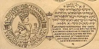 ![]() Medallion commemorating the coronation of Edward VI, with text in Latin, Hebrew and Greek | |