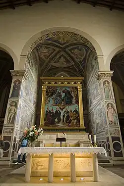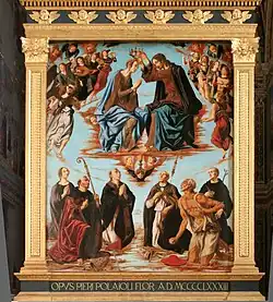 The altarpiece of the Coronation of the Virgin by Piero del Pollaiuolo behind the high altar in the church of Sant'Agostino, San Gimignano in Tuscany, Italy, was painted in 1483.[1] As the painter's only signed and dated work it is a key piece of evidence in the question of which paintings to attribute to Piero and which to his more famous brother, Antonio del Pollaiuolo, which has become a contentious subject in recent years.[2]