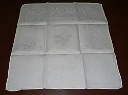 References to linen altar cloths continue throughout the Middle Ages.[1] By Carolingian times, a clear distinction appears between the corporal and the other altar cloths. In the tenth century, Regino of Prüm quotes a council of Reims as having decreed "that the corporal [corporale] upon which the Holy Sacrifice was offered must be of the finest and purest linen without admixture of any other fibre, because Our Saviour's Body was wrapped not in silk, but in clean linen".[7][1]