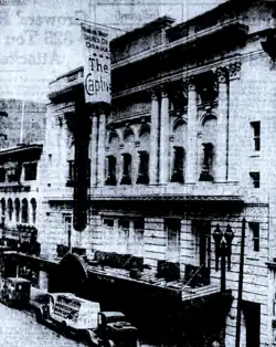The old Curran Theatre was re-named the Century Theatre in September 1921.[12] The theatre became the Morosco Theatre in April 1922 when the theatre was leased by theatrical producer Oliver Morosco,[13] only to have its name changed back to the Century Theatre again the following November when the firm of Ackerman & Harris took over the lease.[14] In June 1923 the theatre was rebranded a final time to the Capitol Theatre. It remained the Capitol Theatre until 1941 when the theatre closed permanently and was demolished. In the 1910s and 1920s the theatre was used as a venue for a variety of plays, musicals, operas, concerts, and silent film screenings, but in the 1930s it became a burlesque theatre establishment.[2]