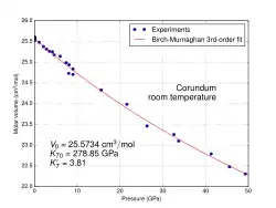 The Young's modulus of corundum (sapphire) has been reported by many different sources with values varying between 300 and 500 GPa, but a commonly cited value used for calculations is 345 GPa.[32] The Young's modulus is temperature dependent, and has been reported in the [0001] direction as 435 GPa at 323 K and 386 GPa at 1,273 K.[32] The shear modulus of corundum is 145 GPa,[33] and the bulk modulus is 240 GPa.[33]