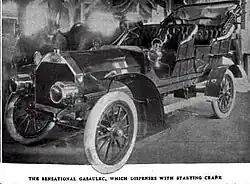 During 1905 and 1906, Corwin produced the Gas-au-lec, a five-place side-entrance tourer with a copper-jacketed four-cylinder four-cycle gasoline (petrol) engine of 40-45 hp (30-34 kW). The company's ads claimed it lacked starting crank, "change speed gears", clutch, cams, valve gear, tappets, and complications,[1] thanks to electromagnetically operated inlet valves.