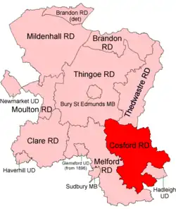 Cosford Rural District was a rural district in the administrative county of West Suffolk, England. It was created in 1894 out of the earlier Cosford rural sanitary district, except for Hadleigh parish which was made a separate urban district. Only minor adjustments were made to its boundary in the reorganisation of 1935.[1] It was named after the historic hundred of Cosford, although the rural district covered a significantly larger area that included most of Cosford hundred (with the notable exception of Hadleigh) and part of the neighbouring hundred of Babergh.