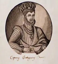 Cosimo Bottegari (1554—1620) was an Italian lutenist and composer of the Late Renaissance era. He was born in Florence and in 1573 became a gentleman of the chamber of the Duke, at the court of Albert V, Duke of Bavaria in Munich,[1] granted of the hereditary equestrian nobility of Bavaria in 1574, with the Heraldic chief of Bavaria and created a Knight of the Order of Saint Stephen 1577, by Francesco I de' Medici, Grand Duke of Tuscany.[2] He left a manuscript of compositions titled Il Libro di canto e liuto[3] which is an important source for Italian songs of the period.[4]