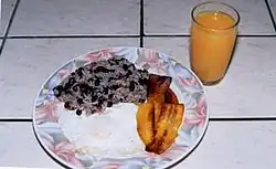 Gallo pinto, which has a literal meaning of "spotted rooster", is the national dish of Costa Rica. It consists of rice and beans stir-fried together in a pan to create a speckled appearance.[2] It is usually served for breakfast along with scrambled or fried eggs and sour cream or cheese.[1] Seasonings in the mixture of rice and red or black beans include cilantro, red pepper, onion, celery, and salsa Lizano.[4] Gallo pinto is also the national dish of neighboring country Nicaragua. There is controversy throughout both countries and their regions as to the perfect composition of beans, rice, and spices in this dish. Pinto, the term the locals use to refer to this dish, is available all over the country at very affordable prices.