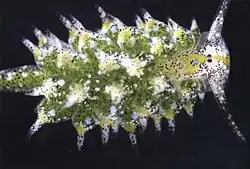 Shell-less Sacoglossan sea slug are often preyed upon by small predatory fish, some nemerteans species, cnidarians, crustaceans, and even some carnivorous coral species.[15] In order to protect themselves from these predators, C. ocellifera was able to develop a chemical defense system by using secondary metabolites that come from the algae they feed on, Avrainvillea. Using Thin-layer chromatography (TLC), scientists were able to identify the metabolite as avrainvilleol. This chemical defense is so effective that in a laboratory test, several slugs were placed into a tank filled with predatory fish (bluehead wrasses), and it was observed that whenever a sea slug was eaten by a fish it was almost immediately spit back out, unharmed.[16] In addition to the chemical defense mechanism, these sea slugs have also evolved an effective camouflage defense. This is because they digest algae chloroplasts, which turns their cerata green in color. This helps them blend in with the surrounding algae.[17][6]