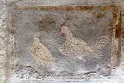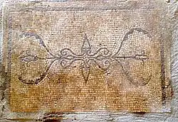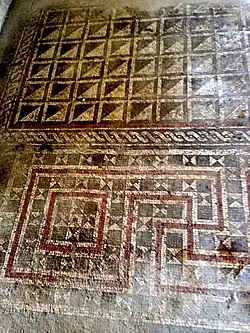 The villa had a manor-type country residence part, embellished with sculptural decorations, architectural terracotta and excellently preserved geometric mosaic floors, made with local limestone and with Cottanello red marble.[4] The villa has an area of about 37 x 45 m and is composed of about 30 rooms with an atrium and a peristyle. One of the door thresholds has figured inserts with plant motifs, another depicts a pair of chanterelles. The walls are covered with painted plaster; some remains of stucco decoration are evident.
